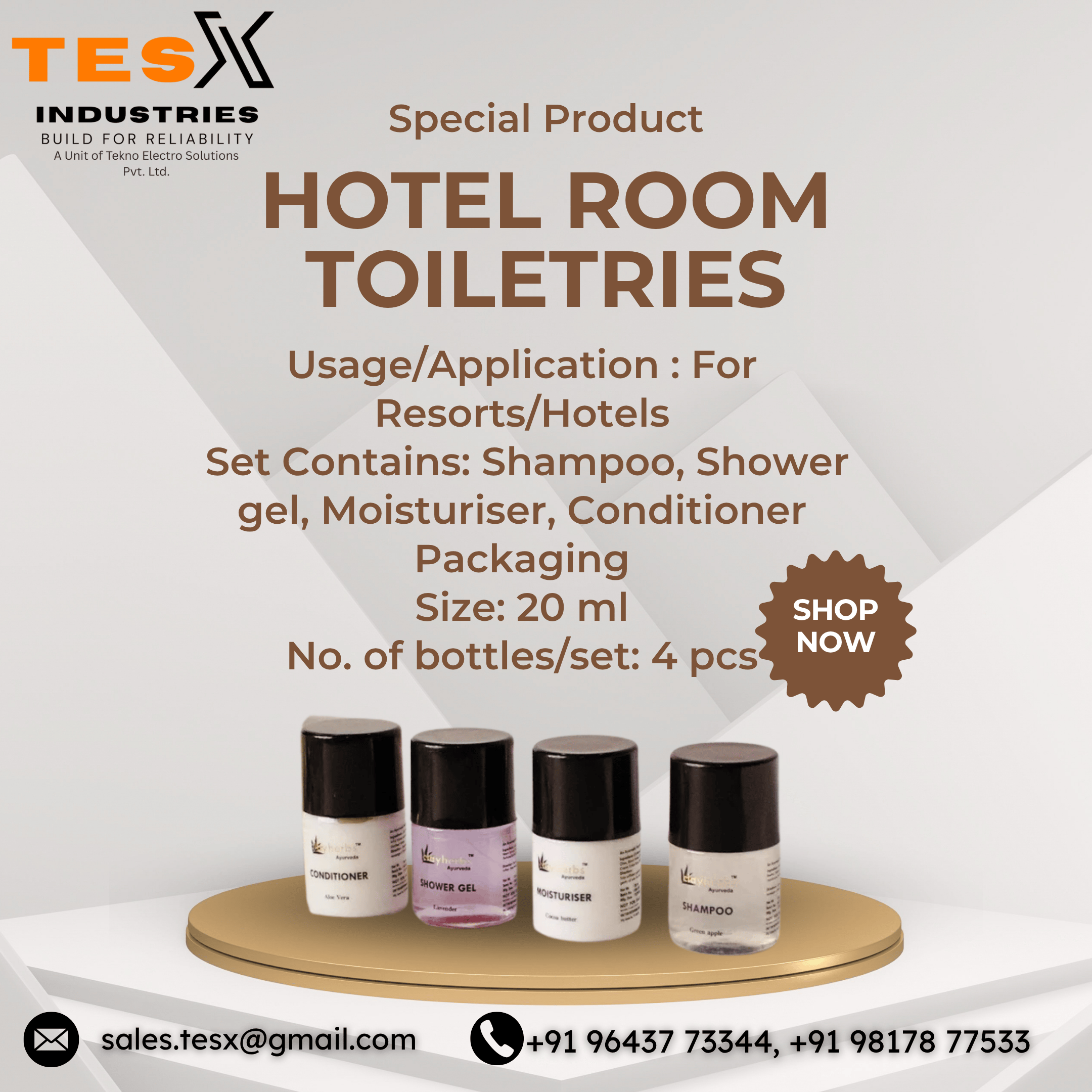 TESX Industries offers a Hotel Room Toiletries Set, which is a 4-piece luxurious collection of personal care amenities intended to enhance the comfort of guests in hotels, resorts, and serviced accommodations.