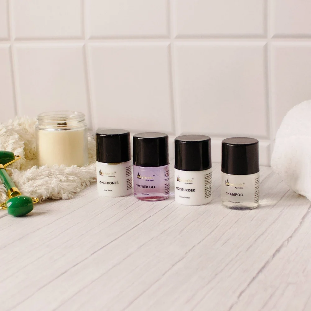 It includes Shampoo, Shower Gel, Moisturiser, and Conditioner in 20 ml bottles each, enough for one use and fully complying with the highest hygienic requirements. The small size guarantees that they are easy to handle and store, while their elegant packaging adds a professional touch to any guest room.