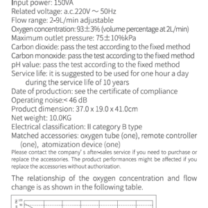 This is 2-9L Portable Oxygen Concentrator model no: TESJY88. This product is come with very nice build quality. The Flow rate of oxygen is divided into 7 levels means in 2L flows in 93% ±3% oxygen purity & 9L Flow in 30% as well, Press the flow button on the screen to adjust the required flow. TESJY88 and high matching version models, the flow rate is 2L /min TESJY88 and high matching version models, the oxygen purity is ≥93%. When the flow rate is 2L /min. Maximum Output Pressure: 75+-10% kPa