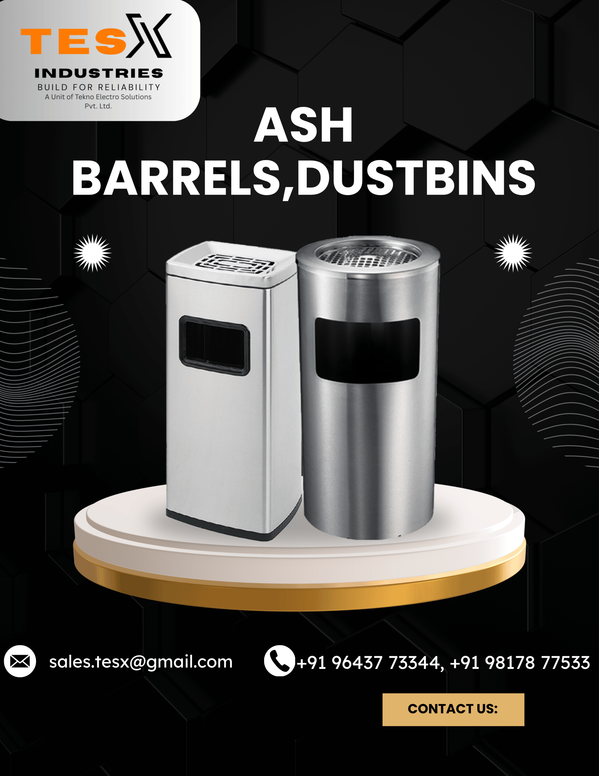 TESX Industries Stainless Steel Ash Barrel: Durable, rust-resistant, and elegant disposal unit made of high-quality SS 202/304. Suitable for hotels, resorts, offices, and public areas due to easy cleaning and modern design.