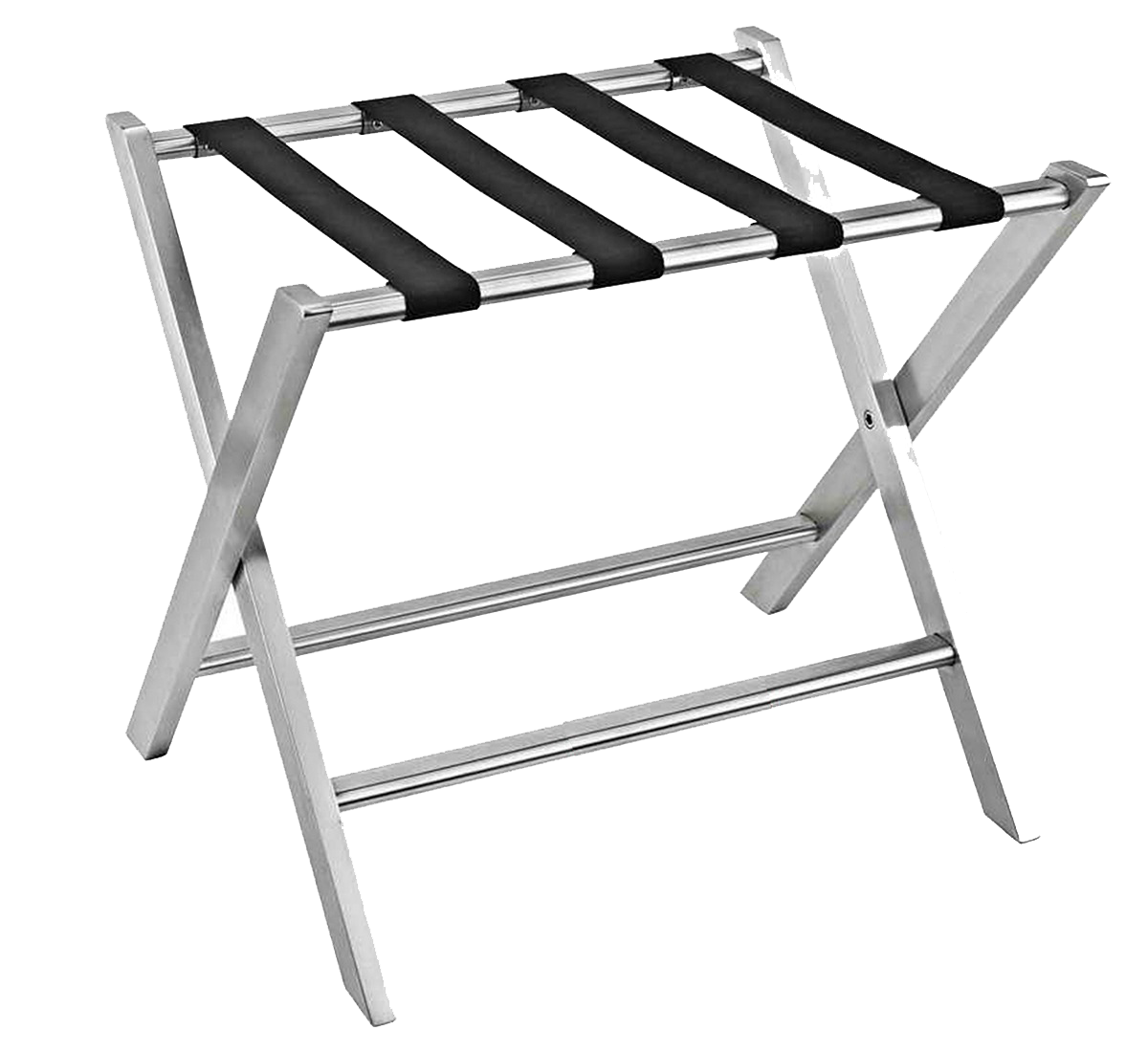 TESX Industries Stainless Steel Luggage Racks are strong, foldable, and fashionably styled hotel luggage racks made of nylon/leather straps, with non-slip feet and a rust-resistant design, apt for hotels, resorts, and guest rooms.